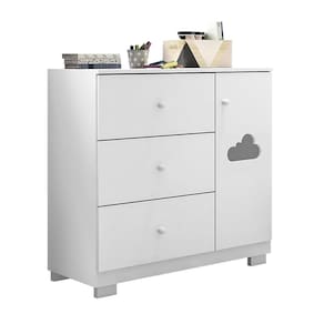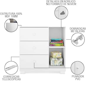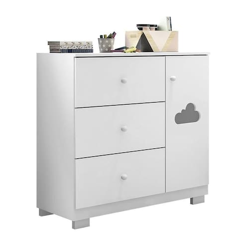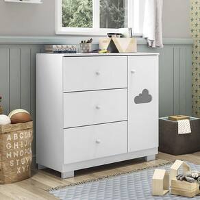 Contando com 1 porta, 1 prateleira e 3 gavetas com corrediças telescópicas a Cômoda Ane é um clássico! O detalhe na porta em acrílico no formato de nuvem dá um toque delicado e charmoso ao móvel que é fabricado em MDF com chapas de 12/15mm e revestimento em Pintura UV atóxica, garantindo qualidade, resistência e .