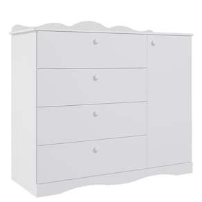 Cômoda Infantil 1 Porta E 4 Gavetas Branco - Permóbili Baby Branco Cômoda Infantil 1 Porta e 4 Gavetas - Permóbili Baby A Cômoda Infantil é ideal para quem precisa de bastante espaço para organizar as roupas dos pequenos. Feita com 100% MDF, um material ecologicamente correto, durável e resistente, a cômoda conta com 4 gavetas amplas equipadas com corrediças telescópicas, garantindo deslizamento suave, maior abertura e fácil acesso às roupas. Além disso, possui uma porta com prateleira interna e cabideiro, que você pode ajustar conforme suas necessidades. O tampo tem bordas arredondadas com pintura em laca atóxica, enquanto as peças retas recebem pintura UV também atóxica. Os puxadores são feitos de plástico ABS, oferecendo excelente acabamento e resistência. O toque final de charme fica por conta da moldura com curvas no estilo provençal, acrescentando um toque decorativo ao quarto das crianças. ESPECIFICAÇÕES: - Estrutura em MDF - Fundo em HDF 2,5mm - Pintura UV - 1 Porta - Dobradiças metálicas - 4 Gavetas - Corrediças telescópicas - Cabideiro de alumínio - Tampo com bordas arredondadas e acabamento em laca - 2 Opções de montagem: prateleira removível e cabideiro - Puxadores em ABS - Suporta até 3Kg em cada gaveta