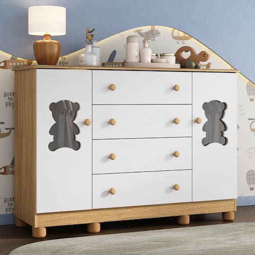 - 2 portas e 4 gavetas (frontais em MDF): amplo espaço interno para organizar roupinhas e acessórios.