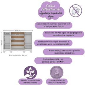 - 2 portas e 4 gavetas (frontais em MDF): amplo espaço interno para organizar roupinhas e acessórios.