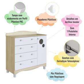 Comoda Infantil 4 Gavetas 1 Porta com Pes Encanto Completa Moveis A Comoda Infantil 4 Gavetas e 1 Porta Linha Encanto da Completa Moveis e versatil, e elegante, com caracteristicas que a destacam. Ideal para o quarto do seu bebe, alem de permitir que a use como trocador/ fraldario! Gavetas que facilitam e otimizam o espaco e aconchego para o ambiente. Produto em MDP com corredicas telescopicas, puxadores em plastico e pes com regulagem de altura, o que a torna um diferencial!