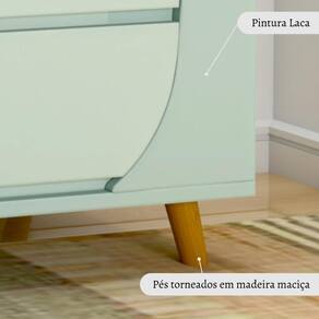 Cômoda Infantil 4 Gavetas 2 Portas Fiori Timber Verde. O equilíbrio perfeito entre o design moderno e as linhas orgânicas, inspiradas nos formatos das flores: esse é o conceito base da Linha Fiori. O resultado é uma linha que proporciona ao ambiente muito charme e leveza, além da qualidade que é marca registrada da Timber. Possui a estrutura reforçada, sendo utilizado madeira e MDF de 2,5cm de espessura em sua fabricação. Os pés são torneados em madeira maciça. A pintura laca proporciona um acabamento de alto padrão. O seu design frontal acompanha o desenho do berço, tornando a decoração do quarto harmônica. Possui 2 portas laterais e 4 gavetas, otimizando o espaço útil interno. As dobradiças são soft close (fechamento com amortecimento). As corrediças são telescópicas e reforçadas, podendo suportar até 30 kg. Marca: Timber Ean: 7908308793439