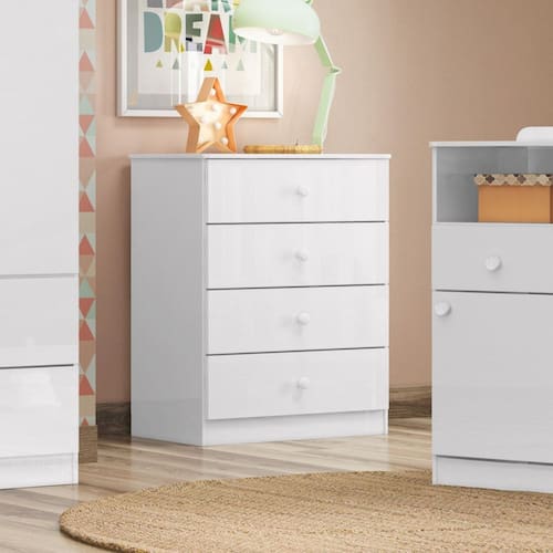 Com 4 gavetas espaçosas e corrediças metálicas, ela garante organização e fácil acesso às roupinhas e acessórios.