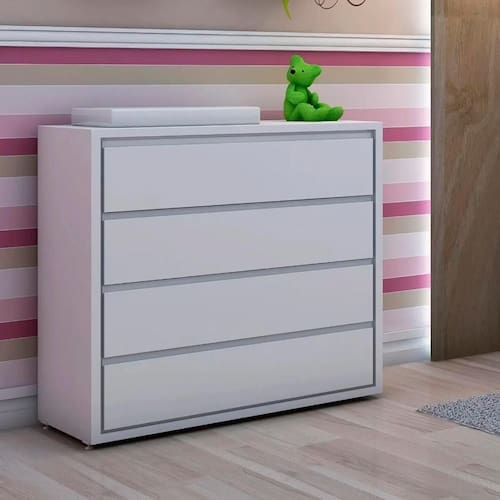 Cômoda Sol e Mar produzida 100% em MDF possui 4 gavetas com trilhos telescópicos que garantem maior suavidade para deslizar ao abrir e fechar as mesmas. Além disso possui sapatas niveladoras que isolam a madeira do piso não deixando que a mesma fique exposta a umidade. Esse produto possui as seguintes opções de cores: toda branca/branca com amadeirado.