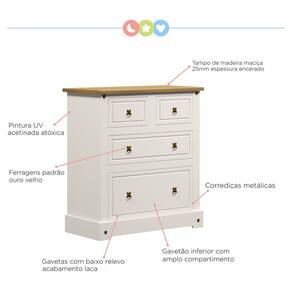 Especializada em móveis, a Serpil prioriza a segurança, o conforto e o bem-estar, por isso desenvolve produtos que seguem as normas de segurança, garantindo a qualidade dos móveis. A cômoda Smile conta com quatro gavetas e corrediças metálicas. Sua estrutura tem corpo em MDF 15mm e tampo em madeira maciça de Pinus 25mm. Sendo assim um móvel durável e de alta qualidade. A cômoda Smile é perfeita para o seu quarto, ela une funcionalidade e beleza em um só produto estilo veio vintage e retrô, deixando o ambiente muito mais confortável e bonito. Acabamento da Gaveta: Pintura UV Acabamento da Porta: Acabamento da Prateleira: Acabamento dos Pés: Acompanha a Almofada: Não Altura do Espelho: Altura do Espelho 01: Altura do Espelho 02: Altura do Espelho 03: Altura do Espelho 04: Altura do Espelho 05: Altura do Espelho 06: Altura dos Pés: Ambiente Principal: Quarto Infantil Complexidade da Montagem: Baixa: pode ser montado por uma pessoa sozinha Cor: Creme/Carvalho Cor: Creme/Carvalho Cor do Produto: Creme/Carvalho Cor Flex: Cor Interna: Creme Escala de Brilho: Semi-Fosco Escala de Brilho da Gaveta: Semi-Fosco Escala de Brilho da Porta: Escala de Brilho da Prateleira: Espessura do Espelho: Fita Integrada: Formato do Espelho: Gaveta com Chave: Não Informações Complementares: Itens Inclusos: 1 Cômoda e Manual de Montagem. Largura do Espelho: Largura do Espelho 01: Largura do Espelho 02: Largura do Espelho 03: Largura do Espelho 04: Largura do Espelho 05: Largura do Espelho 06: Linha ou Coleção: Smile Manual de Especificação Técnica: Manual de Montagem e Instalação: https://cdn2.madeiramadeira.com.br/atributo/serpil-m-veis/748182-146019-comoda-smile-4g-c-943.pdf Material da Gaveta: MDF Material da Porta: Material da Prateleira: Material do Fundo: Chapa MDF 3mm Material do Puxador da Gaveta: Metal Material do Puxador da Porta: Material dos Pés: Material Principal: MDF Montagem Flex: Necessita Montagem: Sim Origem do Produto: Nacional Pés Reguláveis: Peso: 46 Peso Máximo por Gaveta: 5 Peso Máximo por Prateleira: Possui Espelho: Não Possui Nichos: Não Possui Pés: Não Possui Portas: Não Possui Prateleiras: Não Possui Trocador: Não Quantidade de Espelho: Recomendações de Uso, Manutenção e Limpeza: Limpeza com flanela umedecida em água. Rodízio com Trava: Sapatas Niveladoras: Não Sistema de Montagem: Parafusos, cavilhas e minifix. Suporta Até (kg): 30 Tipo de Corrediça da Gaveta: Metálica Simples Tipo de Dobradiça/Corrediça da Porta: Tipo de Fixação do Espelho: Tipo de Madeira Maciça: Tipo de Madeira Maciça da Gaveta: Tipo de Madeira Maciça da Porta: Tipo de Madeira Maciça da Prateleira: Tipo de Madeira Maciça do Puxador da Gaveta: Tipo de Madeira Maciça do Puxador da Porta: Tipo de Madeira Maciça dos Pés: Tipo de Puxador da Gaveta: Externo Tipo de Puxador da Porta: