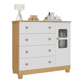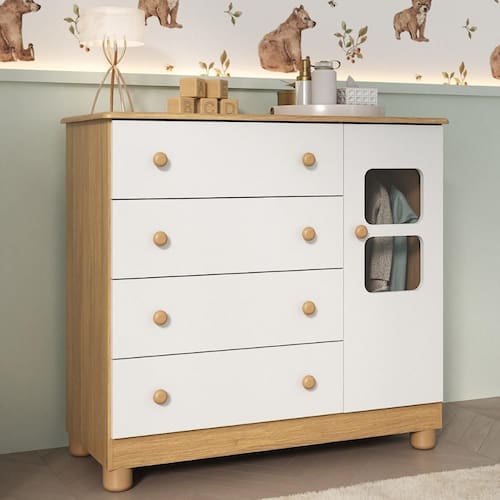 Diferenciais: - 3 anos de garantia contra defeitos de fabricação e material. - Produzida em madeira de reflorestamento (MDP 12/15mm) com acabamento acetinado (cerca de 20% de brilho): sustentabilidade e durabilidade. - 1 porta e 4 gavetas (frontais em MDF): amplo espaço interno para organizar roupinhas e acessórios. - Detalhes de vidro incolor temperado 3mm na porta: toque charmoso que permite visualizar o interior do móvel. - Corrediças telescópicas: permitem a abertura total e o manuseio silencioso das gavetas. - Cabideiro em alumínio: acomoda as roupas para que não amassem. - Puxadores em ABS redondos e práticos. - Pés em polipropileno e rodapé: estabilidade e visual elegante. - Sistema antitombamento: proporciona segurança para o bebê e tranquilidade aos pais.