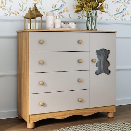 Cômoda Infantil 95cm 1 Porta Com Vidro E 4 Gavetas Ternura Multimóveis Mp4479 Madeirado/off White Madeirado/off White A Cômoda Infantil 95cm 1 Porta com Vidro e 4 Gavetas Ternura Multimóveis MP4479 foi criada para trazer mais leveza à rotina do bebê, oferecendo um cantinho organizado, delicado e cheio de aconchego. Cada detalhe foi pensado para facilitar o dia a dia dos pais e deixar o quarto ainda mais encantador. Um móvel que combina praticidade e carinho em cada gaveta. Diferenciais: - 3 anos de garantia contra defeitos de fabricação e material. - Produzida em madeira de reflorestamento (MDP 12/15mm) com acabamento acetinado (cerca de 20% de brilho): sustentabilidade e durabilidade. - 1 porta e 4 gavetas (frontais em MDF): amplo espaço interno para organizar roupinhas e acessórios. - Detalhe de vidro incolor temperado 3mm na porta: toque charmoso que permite visualizar o interior do móvel. - Corrediças telescópicas: permitem a abertura total e o manuseio silencioso das gavetas. - Cabideiro em alumínio: acomoda as roupas para que não amassem. - Puxadores em ABS redondos e práticos. - Pés em polipropileno e rodapé usinado em MDF: estabilidade e visual elegante. - Sistema antitombamento: proporciona segurança para o bebê e tranquilidade aos pais.