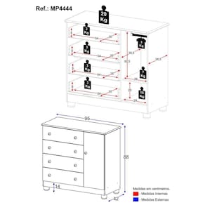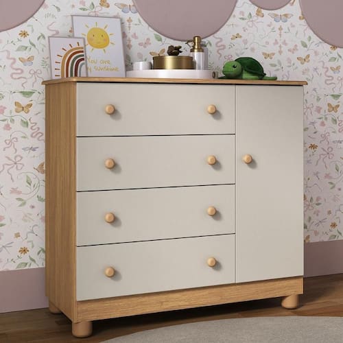 - 1 porta e 4 gavetas: amplo espaço interno para organizar roupinhas e acessórios.