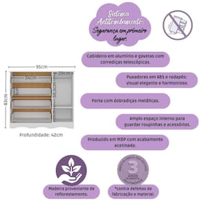 - 1 porta e 4 gavetas: amplo espaço interno para organizar roupinhas e acessórios.