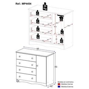 *O produto será entregue desmontado e não disponibilizamos o serviço de montagem. Acabamento: FF/Pintura UV | Material: MDP | Referência do Modelo: MP4454 | Coleção: Realeza | Instruções de Cuidado: Limpar com pano seco para retirar o pó. Não utilizar produtos químicos ou abrasivos a limpeza. Não aplicar lustra móveis. | Sistema de Montagem: O produto acompanha manual de montagem juntamente com kit ferragem. O produto será entregue desmontado e não disponibilizamos o serviço de montagem. | Produto Composto por: 1 cômoda, manual de montagem e kit ferragem. | Com Gaveteiro: Sim | Corrediça: Telescópica | Material do Puxador: ABS | Quantidade de Gavetas: 4 | Quantidade de Portas: 1 | Quantidade de Prateleiras: 1 | Altura Montado: 83 | Largura Montado: 95 | Profundidade Montado: 42 | Tamanho (L x A x P): 95 x 83 x 42 | Tonalidade: Branco | Peso do Produto: 33 | Garantia do Fabricante: 3 | É Desmontável: Não | Fabricante: Multimóveis | Produto: Cômoda | Altura (cm): 83 cm | Largura (cm): 95 cm | Profundidade (cm): 42 cm | Tempo de Garantia: 3 meses | Tipo de móvel: Cômoda | Material das gavetas: MDP | Com corrediças: Sim | Com portas: Sim | Material de dobradiças: Metal | Com prateleiras: Sim | Com prateleiras ajustáveis: Não | Requer Montagem: Sim | Inclui manual de montagem: Sim | Inclui acessórios de montagem: Sim | Peso (kg): 33 kg | Material do corpo: MDP | Estilo: Moderno | Marca: Multimóveis | Quantidade de caixas de embalagem: 02 | Destaque 1: Produzida em MDP: maior durabilidade e resistência. | Destaque 2: Gavetas com corrediças telescópicas: abertura total e silenciosa. | Destaque 3: Puxadores redondos em ABS: práticos e delicados. | Destaque 4: Rodapé: visual elegante e harmonioso. | Destaque 5: Tamanho do produto montado (L x A x P): 95 x 83 x 42 cm | Baterias são necessárias?: Não | Certificação de teste externa: N/A | Dimensões do item P x L x A: depth#value=42;depth#unit=centimeters;width#value=95;width#unit=centimeters;height#value=83;height#unit=centimeters | Is Fragile: Não | Peso do item: unit=kilograms;value=33 | Quantidade de itens: 1 | Número da peça: MP4454.697 | É resistente à umidade: Não | Com alças: Sim | Com pés: Não | Com rodas: Não | Tipo de Garantia: Garantia do Fabricante | Montagem: Necessita Montagem | País de Origem: Brasil | Altura do Produto com Embalagem: 20 cm | Largura do Produto com Embalagem: 46 cm | Comprimento do Produto com Embalagem: 101 cm | Tipo da embalagem do vendor: Sem embalagem adicional | Peso do Produto com Embalagem: 33000 g | Cor: Branco/Madeirado