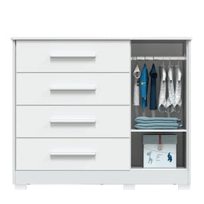 A Cômoda Infantil Charlô Peroba Cor Branco referência 3793.1, com puxadores em ABS, cabideiro metálico, tampo com bordas laqueadas, molduras laterais em MDF revestido, pés reguláveis em ABS inclusos, corrediças telescópicas e sistema antitombamento. A combinação perfeita de estilo, praticidade e segurança, ideal para armazenar roupas, brinquedos e outros itens essenciais. O acabamento em branco traz leveza e luminosidade ao ambiente, enquanto suas linhas retas e suaves garantem um toque contemporâneo. Com 4 gavetas e 1 porta, este móvel oferece amplo espaço para organizar itens do dia a dia, tornando a rotina mais prática. Fabricada em 100% MDF, a cômoda é uma escolha segura para o quarto das crianças. O material é livre de substâncias tóxicas, garantindo um ambiente saudável. Além disso, a resistência do MDF proporciona durabilidade, fazendo com que a cômoda acompanhe o crescimento do seu filho por muitos anos. As gavetas são ideais para armazenar roupas, enquanto o compartimento com porta pode ser utilizado para guardar brinquedos ou outros itens maiores.