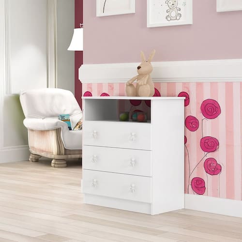 A Cômoda Infantil é a solução prática e elegante para manter o quarto sempre organizado. Com um design funcional, ela oferece amplo espaço interno por meio de gavetas espaçosas, perfeitas para guardar roupinhas, fraldas e outros itens essenciais do dia a dia. Produzida em MDP de qualidade, conta com gavetas que garantem abertura suave e puxadores decorativos plásticos que complementam o visual do móvel. Compacta e versátil, a cômoda se adapta facilmente a diferentes estilos de decoração, unindo praticidade e charme em um só produto. CARACTERÍSTICAS TÉCNICAS: - Estrutura em MDP de 15 mm - Acabamento Brilho na cor Branco - Gavetas com Roldanas - Puxadores Decorativos em Plástico - Dispõe de 1 Nicho - Suporta até 5 kg por Gaveta INFORMAÇÕES TÉCNICAS: Altura: 83 cm Largura: 63 cm Profundidade: 43,5 cm Peso: 25 kg INFORMAÇÕES ADICIONAIS: -ATENÇÃO: Não trabalhamos e não nos responsabilizamos pela montagem do móvel. Antes da montagem conferir se o produto está de acordo com o que comprou, produto montado e danificado pela montagem não será aceito troca. -As imagens ambientadas são meramente ilustrativas e podem apresentar itens que não compõe o produto. As cores do produto podem variar de acordo com o monitor, a iluminação do ambiente ou sua percepção visual. -Limpeza: Deve ser feita com pano macio e seco ou levemente umedecido com água e sabão neutro. Não devem ser utilizados abrasivos como palha de aço e objetos cortantes. Garantia para defeitos de fabricação conforme Código de Defesa do Consumidor.