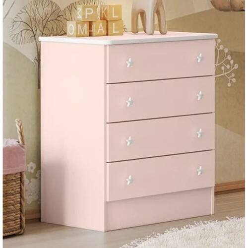 Cômoda 4 Gavetas Doce Sonho Descrição: * Produzido em Mdp de 12 e 15mm; * Pintura U.V. Brilho; * 04 gavetas; * Corrediças metálicas; * Puxadores plásticos em formato de estrela; * Tampo com cantos arredondados com borda em Pvc; Dimensões: Altura: 79,5 cm; Largura: 64 cm; Profundidade: 45 cm;