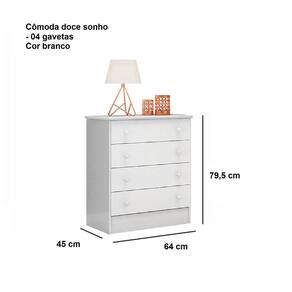 Cômoda 4 Gavetas Doce Sonho Descrição: * Produzido em Mdp de 12 e 15mm; * Pintura U.V. Brilho; * 04 gavetas; * Corrediças metálicas; * Puxadores plásticos em formato de estrela; * Tampo com cantos arredondados com borda em Pvc; Dimensões: Altura: 79,5 cm; Largura: 64 cm; Profundidade: 45 cm;