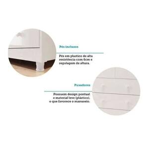 Imagens Meramente Ilustrativas. Não nos responsabilizamos pela montagem/instalação dos produtos. Todas as informações divulgadas são de responsabilidade exclusiva do fabricante/fornecedor. Tipo de Puxador: Puxador em ABS / PVC | Quantidade de Portas: 1 Porta de Abrir | Quantidade de Gavetas: 4 Gavetas | Quantidade de Prateleiras: 1 Prateleira | Tipo de Pintura: Ultravioleta | Tipo de Acabamento da Pintura: Atóxica | Tipo de Cabideiro: Aéreo | Material de Estrutura: MDF | Quantidade de Pés: 6 pés | Tipo dos Pés: ABS/PVC | Tipo de Dobradiças: Dobradiças Metálicas | Tipo de Corrediça: c/ Corrediças Telescópicas | Garantia: Garantia de 90 Dias | Certificação de Qualidade: Qualidade Aprovada | Quantidade de Cabideiros: 1 Cabideiro | Montagem do Produto: Desmontável | Material das Prateleiras: Prateleiras em MDF | Material das Portas: Portas em MDF | Material das Gavetas: Gavetas em MDF | Sistema de Montagem: Inclui kit de instalação | Recomendações de Uso: Recomendações de Uso | Estilo do Móvel: Clássico | Nossa Avaliação: Classificação de Qualidade Muito Boa | Código universal de produto (GTIN): 7908709401230 | Produto precisa de Montagem?: Sim, a montagem é simples mas sugerimos a contratação do nosso de montagem (para os CEPs em que o está disponível) ou de algum experiente de sua preferência | Descrição do Tamanho: cm | Estado de Origem: RJ | País de origem: | Peso Produto Com Embalagem (Kg): | Material para Filtro: N/I | Cor Mobly: N/I | Condição do Item: | Link Site: | Numeral: 0 | Não se Aplica: N/A | Não Possui: Não | Linha/Modelo: Quarto Elô | Cor Cnova: Blush | Cor Meli: Branco | Categoria - Sub: Cômoda Infantil | Categoria - Pai: Quarto do Bebê | Comprimento Embalagem: | Largura Embalagem: | Altura Embalagem: | Kit: 0 | Peso: Kg | Peso Real Kg: | Peso Cubado: | Volumes: 2 | M3: | Comprimento/Profundidade: 50 cm | Largura: 120 cm | Altura: 113 cm | Tamanho Montado: x Comp/ x Alt: | Comprimento/Profundidade Montado: | Largura Montado: | Altura Montado: | MPN: | Cor Fabricante: Branco/Amendoa | Marca: Móveis Peroba | Fabricante: Móveis Peroba | Linha: Quarto Elô Ean: 7908709401230