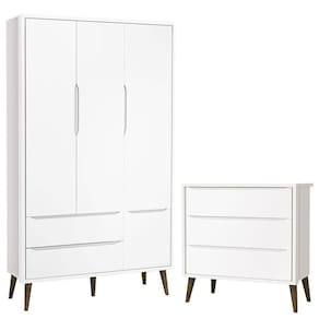 Cômoda Gaveteiro Infantil e Guarda Roupa 3 Portas Theo Branco Acetinado com Pés Amadeirado Reller