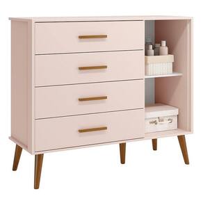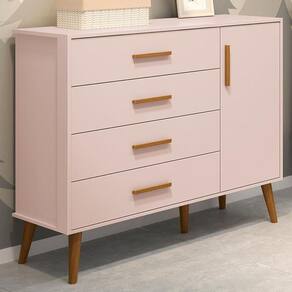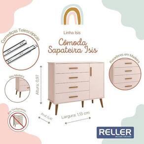 Cômoda Infantil Isis 1 Porta E 4 Gavetas Rosa - Reller Móveis Rosa Cômoda Infantil Isis 1 Porta e 4 Gavetas - Reller Móveis A Cômoda Infantil Isis 1 Porta e 4 Gavetas, possui design moderno um amplo espaço nas gavetas para guardar as roupinhas do bebê dobradas. Produzida 100% MDF, garantindo mais durabilidade e resistência ao produto, as gavetas e a porta possuem puxadores em madeira ideal para mais conforto, praticidade e beleza. ESPECIFICAÇÕES: - Estrutura 100% MDF - Pintura UV atóxica - Acabamento fosco - 1 Porta - Dobradiças metálicas - 4 Gavetas - Corrediças telescópicas - Sistema anti-tombamento - Puxadores em madeira - Pés estilo retrô em madeira - Amplo espaço interno