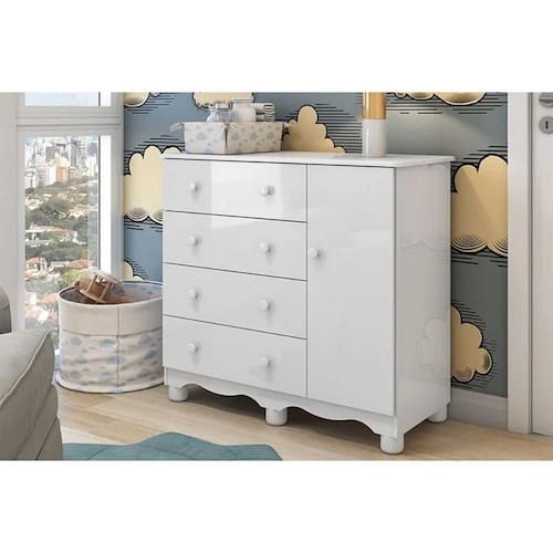 Organize o quarto do bebê com a cômoda infantil Móveis Peroba Junior, ideal para acomodar roupas e acessórios do dia a dia. Com 1 porta de abrir e 4 gavetas, oferece boa capacidade de organização em um móvel compacto. As corrediças telescópicas proporcionam abertura mais suave das gavetas, enquanto os puxadores e pés fixos facilitam o uso cotidiano. O acabamento em pintura ultravioleta semi brilho na cor branca combina com diferentes estilos de decoração infantil. Estruturada em MDF e com design moderno, é uma opção prática para o quarto do bebê.