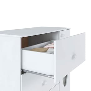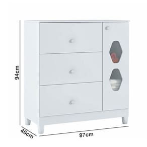 A Cômoda Lolly é um complemento muito nos quartos. A mamãe organiza com praticidade as roupas e acessórios para seu filho. Possui 1 Porta com dobradiças metálica 2 vazados com acrílicos texturizados PS Cristal. 3 práticas gavetas com corrediças metálicas e puxadores bolinha. Pés em plástico resistente que facilita a limpeza.