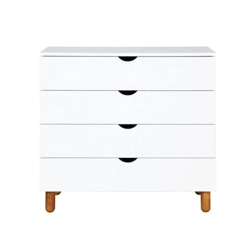 Fabricada em MDF, a cômoda MOOD dispõe de 04 gavetas telescópicas, puxadores usinados e pés em madeira natural.