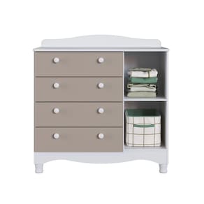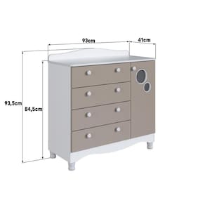 Marca: Completa Móveis | Modelo: Linha Infantil Vintage | Material: MDP | Acabamento: Fosco | Largura (cm): 93 | Altura (cm): 93,5 | Profundidade (cm): 41 | Peso do Produto (Kg): 31,10 | Quantidade de Volume: 2 | Peso Suportado (Kg): 41 | Quantidade de Gavetas: 4 | Tipo da Corrediça: Telescópica | Peso Suportado por Gaveta (Kg): 4 | Possui Chave: Não | Possui Puxador: Sim | Material do Puxador: Plástico | Quantidade de Portas: 1 | Material da Dobradiça: Metálica | Possui Prateleira: Sim | Tipo de Prateleira: Fixa | Peso Suportado por Prateleira (Kg): 5 | Quantidade de Pés: 4 | Material dos Pés: Plástico | Necessita Montagem: Sim | Nível de Dificuldade da Montagem: Médio | Sistema de Montagem: Sistema de montagem via parafusos, cavilhas, pregos, sistema minifix | País de Origem: | Duração da Garantia: 6 meses | Tipo de Garantia: Garantia do Fabricante | Dimensão (A x L x C) cm: 93,5x41x93 | Quantidade de Item: 1 | Tipo de Móvel: Cômoda | Principal Característica do Produto 01: Cômoda Infantil Organizadora | Principal Característica do Produto 02: Cômoda Infantil 4 Gavetas Grande e 1 Porta | Principal Característica do Produto 03: Cômoda Infantil Organizadora com Prateleira e Trocador | Baterias Necessárias: Não | Frágil: Não | Certificação de Teste Externo: Não Possui | Componentes Incluídos: Manual de Montagem | da Peça: ENC003 | Inclui Manual de Montagem: Sim | Cor: Branco com Cinnamon