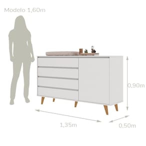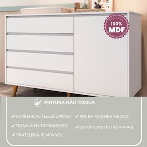 Seu tamanho maior proporciona excelente capacidade de organização, facilitando a rotina com o bebê. Além disso, pode ser utilizada como fraldário, contando com trava anti-tombamento e gavetas com trilhos telescópicos e trava de segurança, garantindo mais proteção e tranquilidade para toda a família.