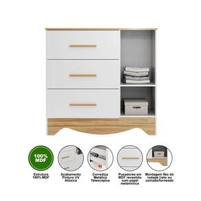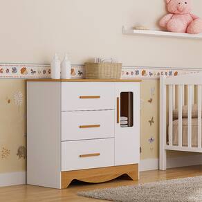 A Cômoda Infantil Popy Retrô 1 Porta Plus é perfeita para manter o quarto do bebê organizado com charme e praticidade. Produzida em 100% MDF com pintura UV atóxica, garante segurança e durabilidade. Possui 3 gavetas espaçosas com corrediças telescópicas, porta com detalhe em PETG cristal e puxadores em MDF revestidos com papel melamínico. O design retrô e as cores Branco Brilho/Amêndoa combinam com qualquer decoração infantil.