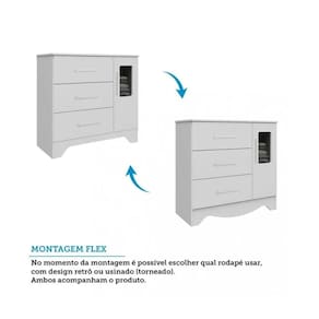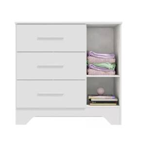 A Cômoda Infantil Popy Retrô Peroba Cor Branco Referência P3042, compuxadores em MDF revestido,corrediças telescópicas, portas com PETG cristal, com 2 opções de rodapé, linho interno e sistema antitombamento.Um design retro encantador com a praticidade que você precisa para manter o espaço organizado. Com três gavetas e uma porta, a cômoda oferece amplo espaço de armazenamento, ideal para roupas, brinquedos e outros itens essenciais do dia a dia.Seu acabamento em branco proporciona uma sensação de leveza e luminosidade ao quarto, enquanto os detalhes retrô adicionam um charme especial. O design é pensado para se integrar facilmente a diferentes estilos de decoração, tornando-se um elemento-chave no ambiente.Com três gavetas amplas e uma porta, esta cômoda oferece a solução perfeita para manter o quarto do seu filho sempre arrumado. As gavetas são ideais para guardar roupas, enquanto a porta pode ser utilizada para armazenar brinquedos ou outros itens que precisam estar fora de vista.