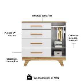 A Cômoda Infantil Retrô 1 Porta com Janela e 4 Gavetas combina praticidade com um design encantador. Com estrutura em MDF e pintura UV atóxica, oferece resistência e segurança para o quarto infantil. Possui 1 porta com janela em PETG Cristal/Acrílico, ideal para visualizar os itens armazenados, além de cabideiro metálico, prateleira e 4 gavetas com corrediças telescópicas, que suportam até 4kg cada. Os puxadores em MDF revestidos e os pés também em MDF reforçam o estilo retrô e a durabilidade do móvel. Uma peça versátil e funcional para manter tudo sempre bem organizado.