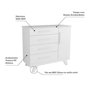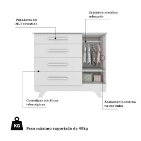 A Cômoda Infantil Retrô 1 Porta com Janela e 4 Gavetas combina praticidade com um design encantador. Com estrutura em MDF e pintura UV atóxica, oferece resistência e segurança para o quarto infantil. Possui 1 porta, além de cabideiro metálico, prateleira e 4 gavetas com corrediças telescópicas, que suportam até 4kg cada. Os puxadores em MDF revestidos e os pés também em MDF reforçam o estilo retrô e a durabilidade do móvel. Uma peça versátil e funcional para manter tudo sempre bem organizado.
