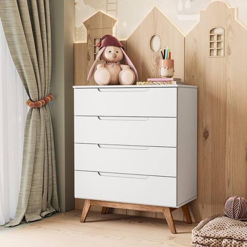 Cômoda Infantil Retrô 4 Gavetas Sonhare Branco. A Cômoda Retrô Sonhare possui um design com charme e elegância nas gavetas, com um detalhe usinado no MDF para servir como puxadores. Produzido em MDP e MDF de 15 mm, possui quatro gavetas com reforço interno e fundos embutidos para dar mais estrutura ao produto. Os pés são chassi deixando o produto robusto e com classe.