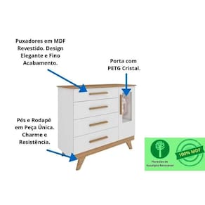 Cômoda Infantil Retrô c/ 1 Porta Cristal e 4 Gavetas Branco/Amendoa - Peroba