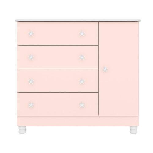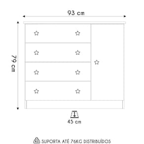 A Cômoda Infantil possui 4 gavetas que são equipadas com corrediças metálicas para um deslizar suave, e conta ainda com uma porta que funciona como sapateira com dobradiças metálicas, oferecendo praticidade com prateleira interna proporcionando mais espaço e organização no ambiente. Acompanha pés opcionais em PVC que oferecem uma base estável, evitando o contato direto com o chão, enquanto os puxadores duplos de plástico poliestireno, com formato de estrela proporcionam um toque mágico ao móvel. O acabamento de alta qualidade, revestido em pintura UV, realça a cor, trazendo um toque elegante. Além disso, a cômoda possui sistema antitombamento, oferecendo ainda mais segurança. Essa Cômoda Sapateira É perfeita para quem procura aliar estilo na decoração, tornando o quarto do bebê acolhedor para todas as necessidades do dia a dia.