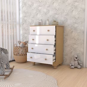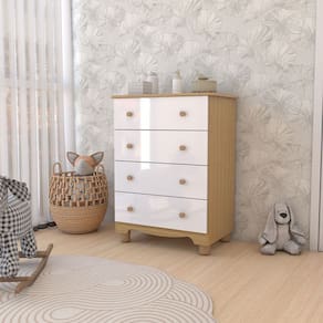 O(a) Cômoda Infantil Sueño 4 Gavetas 100% Mdf Branco Brilho/Amêndoa - Loja é produzido em 100% MDF na escala de brilho Brilhante e Semi-Brilho, e possui um grau de dificuldade de montagem: Médio.