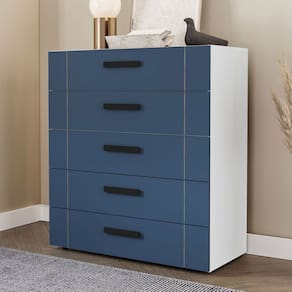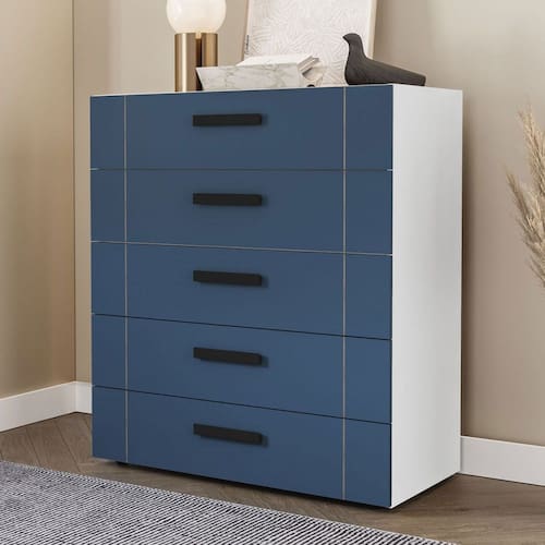 O(a) Cômoda Lisboa 5 Gavetas Branco/Azul - Politorno é produzido em MDF e MDP na escala de brilho Semi-Fosco, e possui um grau de dificuldade de montagem: Médio.