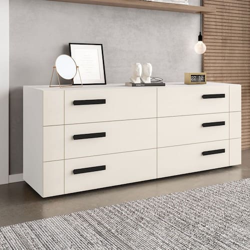 O(a) Cômoda Lisboa 6 Gavetas Branco/Creme - Politorno é produzido em MDF e MDP na escala de brilho Semi-Fosco, e possui um grau de dificuldade de montagem: Médio.