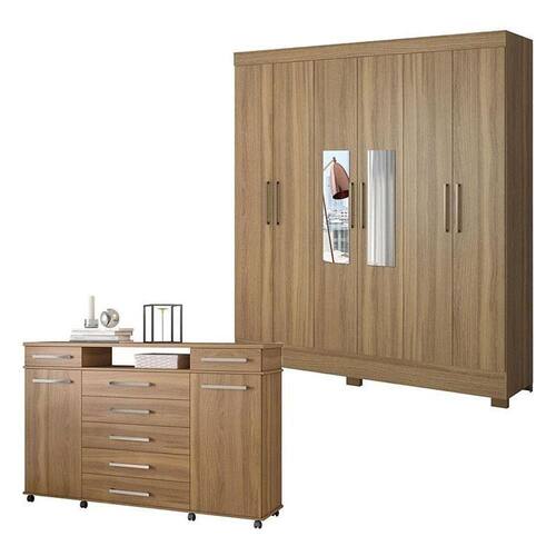 Cômoda London e Guarda Roupa Casal Prático Amêndola Touch com Espelho - Demóbile