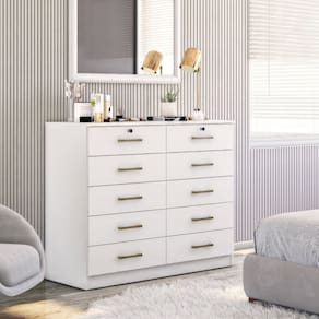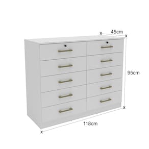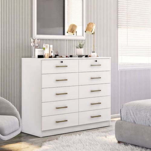 Transforme seu quarto com a elegante cômoda Londres! Com 10 gavetas espaçosas e chaves para segurança adicional, esta peça não só otimiza o espaço, mas também adiciona um toque de beleza ao seu ambiente. Disponível nas cores branco e mel, com puxadores na sofisticada tonalidade champagne. Acabamento da Gaveta: Finish Foil Ambiente Principal: Quarto Complexidade da Montagem: Baixa: pode ser montado por uma pessoa sozinha Cor: Branco Cor do Produto: Branco Cor Flex: Não Cor Interna: Branco Escala de Brilho: Fosco Escala de Brilho da Gaveta: Fosco Gaveta com Chave: Sim Itens Inclusos: 1 cômoda e manual de montagem Linha ou Coleção: Quarto Manual de Montagem e Instalação: https://product-hub-prd.madeiramadeira.com.br/911767/documents/853c17dd-1746-488b-8579-f24071fe15851996898522517170167971123.pdf Material da Gaveta: MDP Material do Fundo: MDF Material do Puxador da Gaveta: PVC Material Principal: MDP Montagem Flex: Não Necessita Montagem: Sim Origem do Produto: Nacional Peso: 55,2 kg Peso Máximo por Gaveta: 5 kg Possui Espelho: Não Possui Nichos: Não Possui Pés: Não Possui Portas: Não Possui Prateleiras: Não Quantidade de Gavetas: 10 Gavetas Recomendações de Uso, Manutenção e Limpeza: Para a limpeza do móvel utilizar pano levemente umedecido com água e sabão neutro Sapatas Niveladoras: Não Sistema de Montagem: Parafusos, cavilhas e minifix Suporta Até (kg): 55 kg Tipo de Corrediça da Gaveta: Metálica Simples Tipo de Puxador da Gaveta: Externo Marca: Mademovel