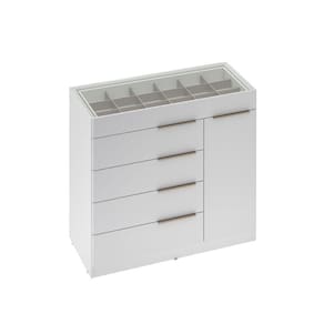 Possui divisões para colocar itens diversos e tampo de vidro para facilitar a visualização desses itens. Ampla porta com prateleira interna, 5 gavetas com corrediças telescópicas e puxadores metálicos. Todos os materiais utilizados são de altíssima qualidade! Com visual elegante, moderno e palhetas de cores destinadas aos dormitórios