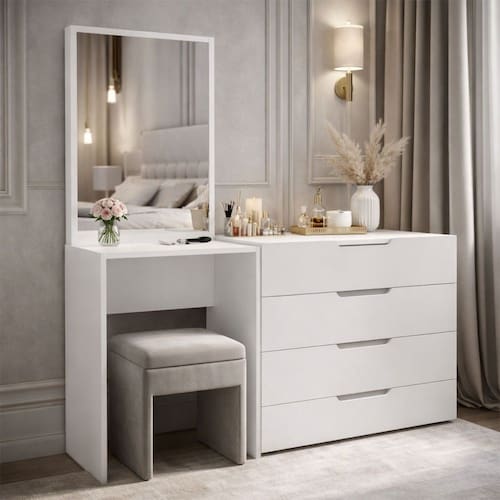 O(a) Cômoda Madrid 4 Gavetas com Espelho Branco - Politorno é produzido em MDP na escala de brilho Semi-Fosco, e possui um grau de dificuldade de montagem: Médio.