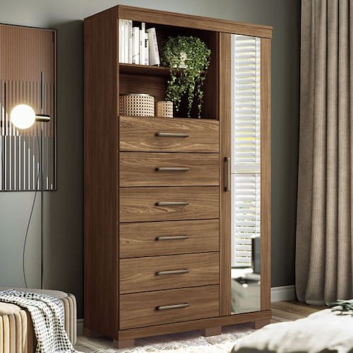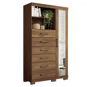 O(a) Cômoda Marabá 6 Gavetas 1 Porta com Espelho Jatoba - Santos Andirá é produzido em MDP e HDF na escala de brilho Brilhante, e possui um grau de dificuldade de montagem: Médio.