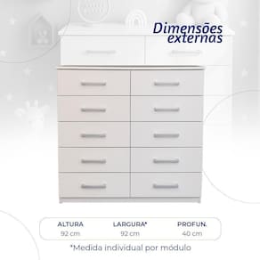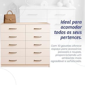 Produzida em MDP de alta qualidade, garantindo resistência e durabilidade.Gavetas em madeira Pinus com corrediças plásticas, proporcionando um deslizamento suave.Puxadores em polipropileno cromado, que conferem um toque de sofisticação.Acabamento fosco que harmoniza com diferentes estilos de decoração.Sistema de montagem por cavilhas e minifix, facilitando a ão possui prateleiras, maximizando o espaço das ícios e FuncionalidadesAmplo Espaço Interno: Com 10 gavetas espaçosas, a cômoda oferece excelente capacidade de organização, ideal para o dia a Moderno: O acabamento fosco e os puxadores cromados trazem um toque de elegância ao ambiente, tornando-a uma peça de destaque.Durabilidade: A estrutura em MDP e as gavetas em pinus garantem resistência, mesmo com o uso diário.Versatilidade: Perfeita para diferentes ambientes, seja em quartos de casal, solteiro ou infantil.Montagem Simples: O sistema prático de montagem é ideal para quem não tem experiência, tornando o processo rápido e fácil.Observações Importantes