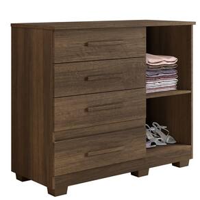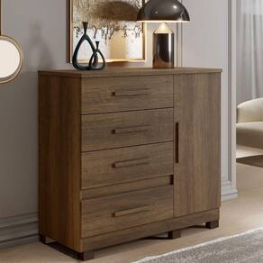 Cômoda Melissa 4 Gavetas 1 Porta Com Sapateira - Benetil Imbuia A Comoda Melissa com seu lindo design traz charme e elegancia a qualquer espaco, contem 1 porta e 1 prateleira para acomodar seus acessorios, alem de possuir 4 gavetas com corredicas telescopicas que proporcionam uma maior suavidade em seu uso, ideal para pequenos espacos. Sua fabricacao utiliza a linha mdp perffect 15 mm, que une a sustentabilidade a inovacao tecnologica, proporcionando durabilidade e facil limpeza; inspirando sofisticacao ao mobiliario. A Comoda Melissa possui pintura UV que conta com boa resistencia, e facil de limpar e e ecologicamente correto, pois utiliza madeira de reflorestamento, evitando o desmatamento. Caracteristicas: Material principal: MDP Espessura das chapas: 15 mm Escala de brilho: semi fosco Acabamento: Pintura UV Sistema de montagem: parafuso, cavilha e cantoneiras metalicas Quantidade de Gavetas: 4 Quantidade de Portas: 1