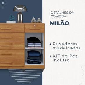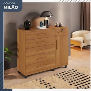 A Cômoda Milão é produzido em chapa de 15 mm que garante robustez e maior vida útil, contem 1 portas, 1 prateleira, 6 gavetas sendo 1 com chave, com corrediças telescópica, pés inclusos no produto e puxadores na cor, ótimo custo benefício.
