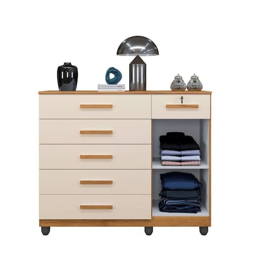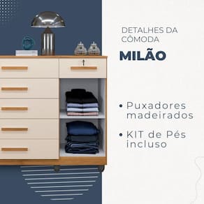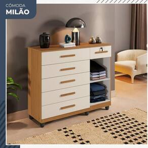 A comoda Milao e produzido em chapa de 15 mm que garante robustez e maior vida util, contem 1 portas, 1 prateleira, 6 gavetas sendo 1 com chave, com corredicas telescopica, pes inclusos no produto e puxadores amadeirados na cor do produto.