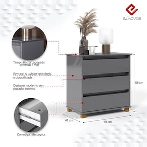 Com a mini cômoda seu quarto estará mais completo e seus pertences bem organizado. Um móvel versátil e funcional, sem puxadores externos e três gavetas com corrediças telescópicas, trazendo um excelente espaço interno que é ideal para acomodar roupas e objetos. A mini cômoda é produzida com material de qualidade, um móvel com design inovador e sua estrutura robusta é ideal para quem busca elegância e funcionalidade em um único produto.