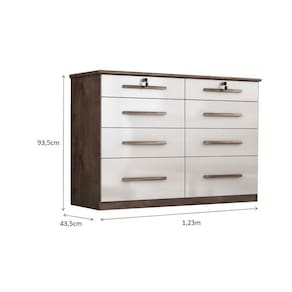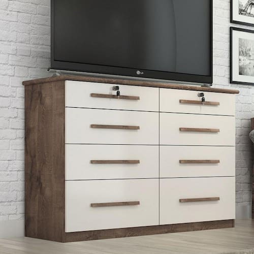 COMODA MONZA| Com 8 gavetas dispõe de um design sofisticado é própria para pessoas exigentes com organização. Possui um acabamento arredondado no tampo de 25 mm que enobrece o produto e o deixa mais resistente e belo. As gavetas tem corrediças metálicas o que facilitam a montagem. Suporta pesos de até 7kg em suas gavetas e 20kg no tampo suficiente para acomodar televisores. As gavetas possuem tamanhos diferentes sendo as primeiras com chave, as do meio gavetas medias e as ultimas gavetões. Logo, essa cômoda é ideal para guardar roupas, meias, cuecas e objetos pessoais com privacidade.