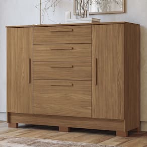 O(a) Cômoda Pinhais 2 Portas 4 Gavetas Jatoba- Santos Andirá é produzido em MDP e HDF na escala de brilho Semi-Fosco, e possui um grau de dificuldade de montagem: Médio.