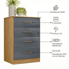 Cômoda Ms913 4 Gavetas MDF Puxadores Plástico Cinza Freijó para Quarto Organizador de Roupas