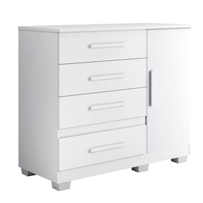 Cômoda New Florença 4 Gavetas 1 Porta Com Sapateira -benetil Branco A Comoda New Florenca com seu lindo design traz charme e elegancia a qualquer espaco, contem 1 porta e 1 prateleira para acomodar seus acessorios, alem de possuir 4 gavetas com corredicas telescopicas que proporcionam uma maior suavidade em seu uso, ideal para pequenos espacos. Sua fabricacao utiliza a linha mdp perffect 15 mm, que une a sustentabilidade a inovacao tecnologica, proporcionando durabilidade e facil limpeza; inspirando sofisticacao ao mobiliario. Possui acabamento em pintura UV que conta com boa resistencia, e facil de limpar e e ecologicamente correto, pois utiliza madeira de reflorestamento, evitando o desmatamento. Caracteristicas: Material principal: MDP Escala de brilho: semi fosco Espessura das chapas: 15 mm Acabamento: Pintura UV Sistema de montagem: parafuso, cavilha e cantoneiras metalicas Quantidade de portas: 01 Quantidade de prateleiras: 01 Quantidade de gavetas: 04 Corredicas: telescopicas
